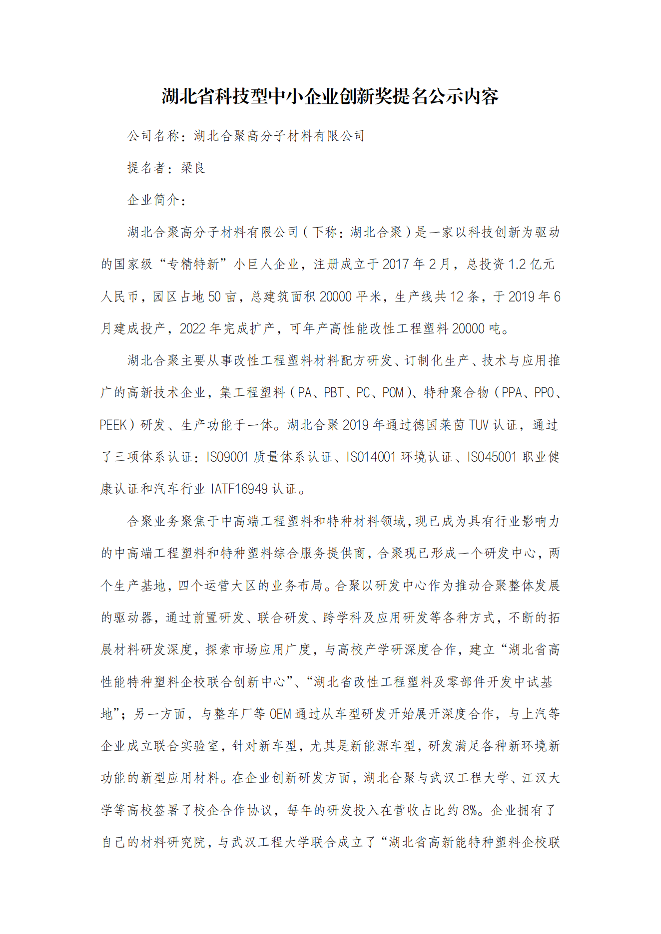 湖北省科技型中小企業(yè)創(chuàng)新獎提名公示內容